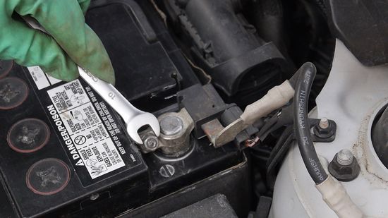 کابل های ترمینال باتری را با باز کردن پیچ های روی بست کابل جدا کنید. ابتدا کابل منفی و سپس کابل مثبت را بردارید.