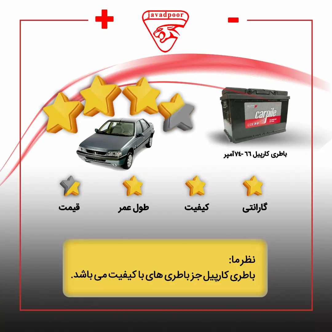 باتری کارپیل جزو بهترین باتری های ایرانی هست و علاوه بر قیمت خوب دارای کیفیت خیلی خوبی هست و طول عمر مناسب و گارانتی طلایی جوادپور رو داره اگه باتری خوبی میخواید برای ماشینتون بخرید و قیمت خیلی مهم نیست براتون این باتری مناسب شماست.